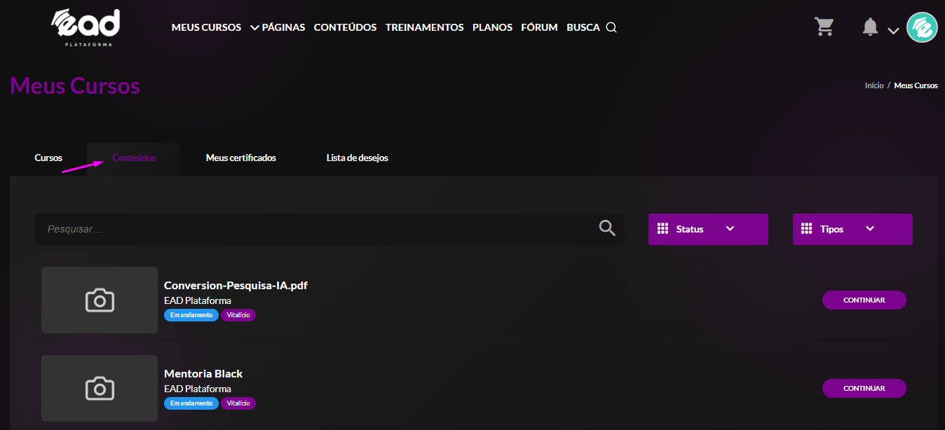 Os produtos do tipo e-book e mentoria ficam listados na aba "conteúdos" após o login do aluno, conforme exemplo a seguir: