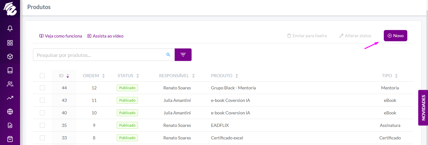 Para criar seu produto, acesse: Menu > Produtos > Todos os Produtos > Novo: