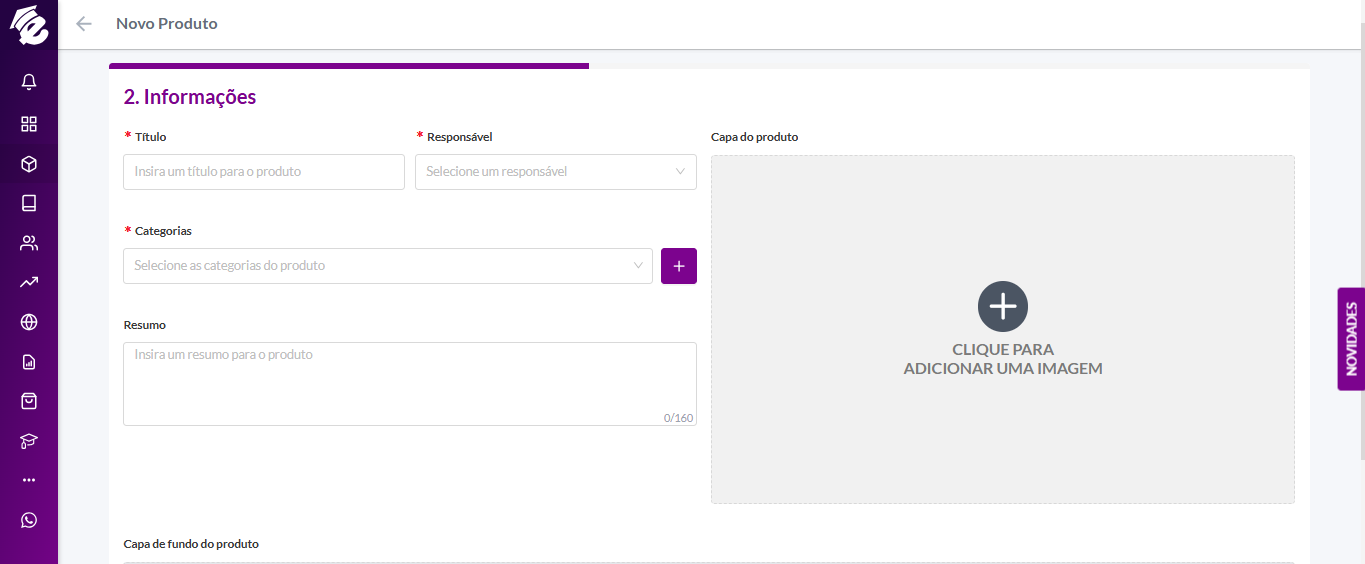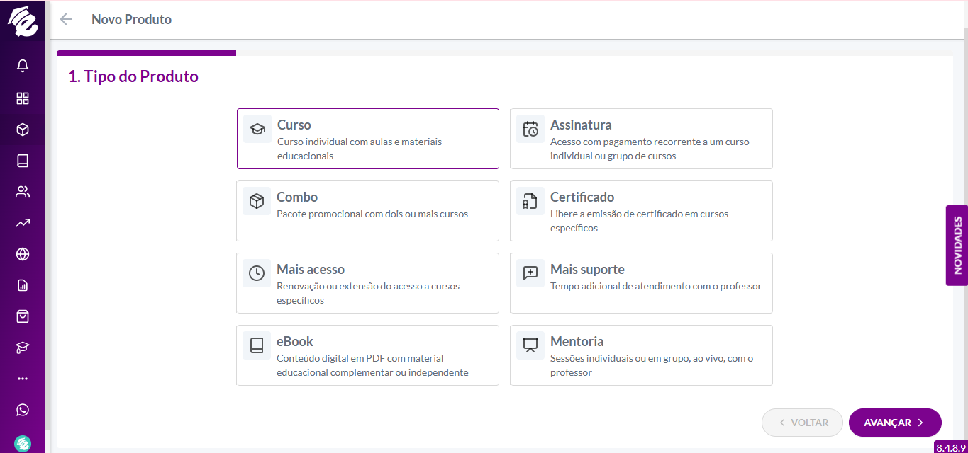 Após escolher o tipo de produto, preencha a tela de informações, cobrança , selecione o curso, defina as imagens de tema e por último, clique em "Finalizar".