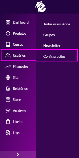 As configurações gerais sobre usuários ficam listadas nessa seção, como a criação de novas permissões, campos personalizados no cadastro de usuário e outras opções. Para acessar, clique no menu lateral em Usuários > Configurações: