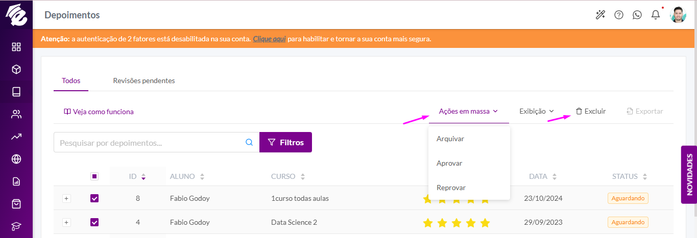 Caso queira **arquivar, aprovar, reprovar **ou até mesmo **excluir ** vários depoimentos de uma só vez, clique na caixa de seleção e depois na opção que deseja: