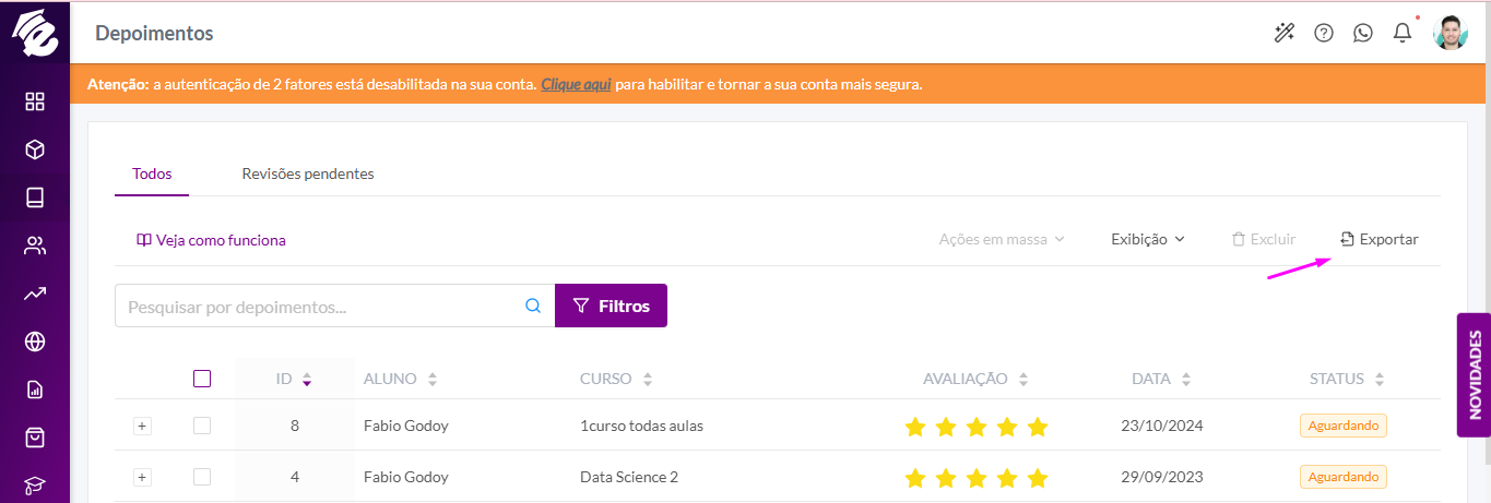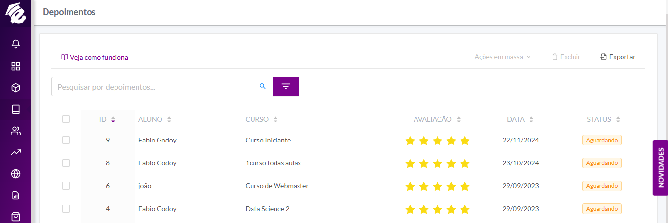 Para acessar os depoimentos, clique no menu lateral em Cursos > Depoimentos