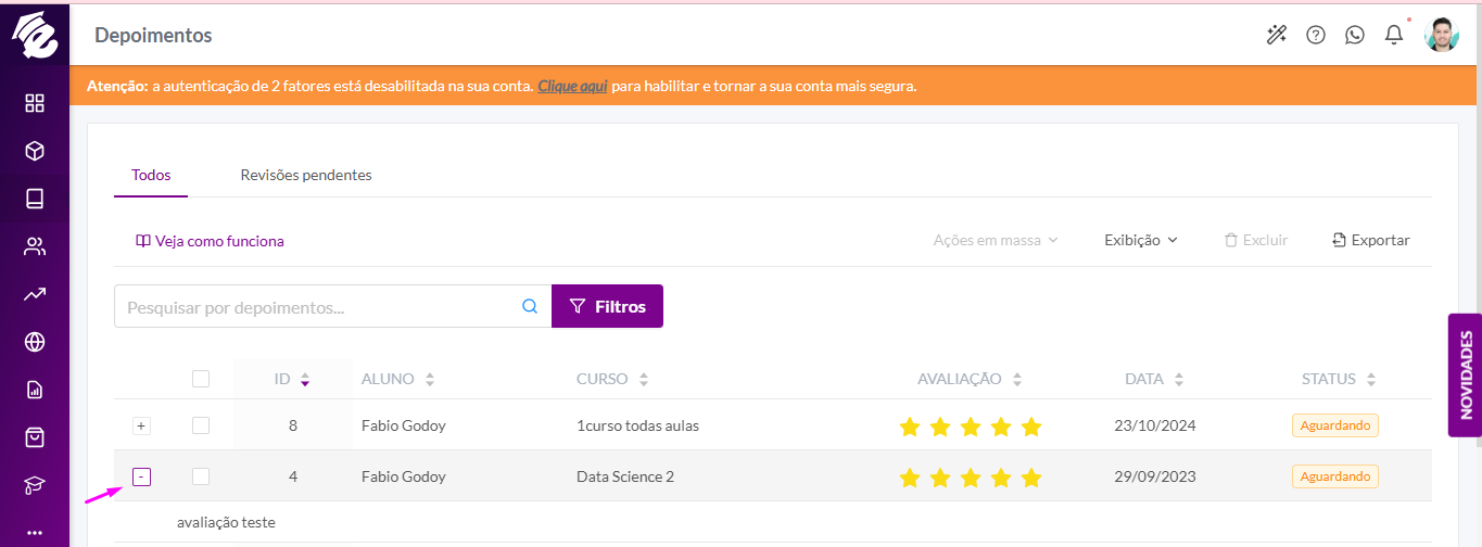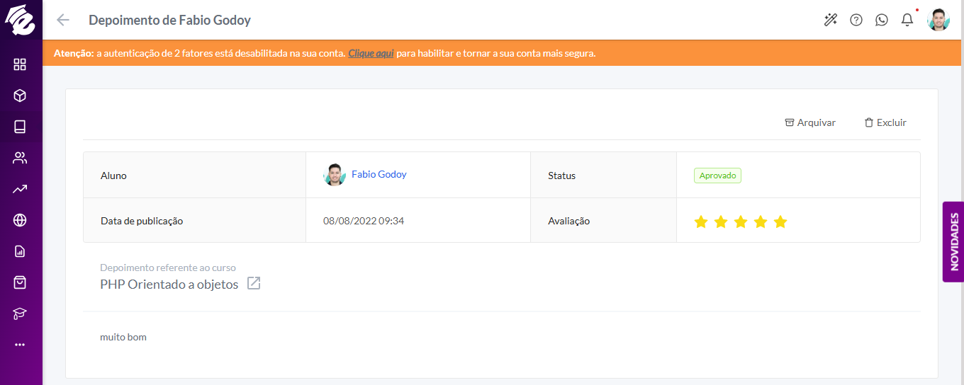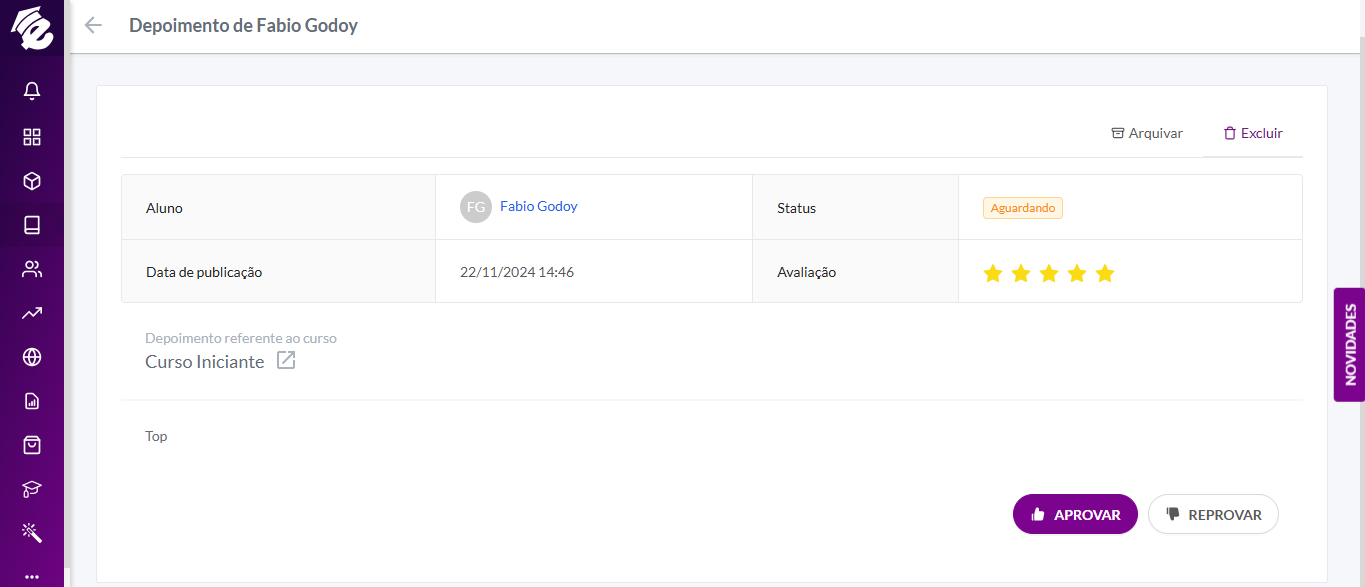 E assim, o administrador pode analisar os depoimentos e aprová-los para que apareçam na página de detalhes do curso.