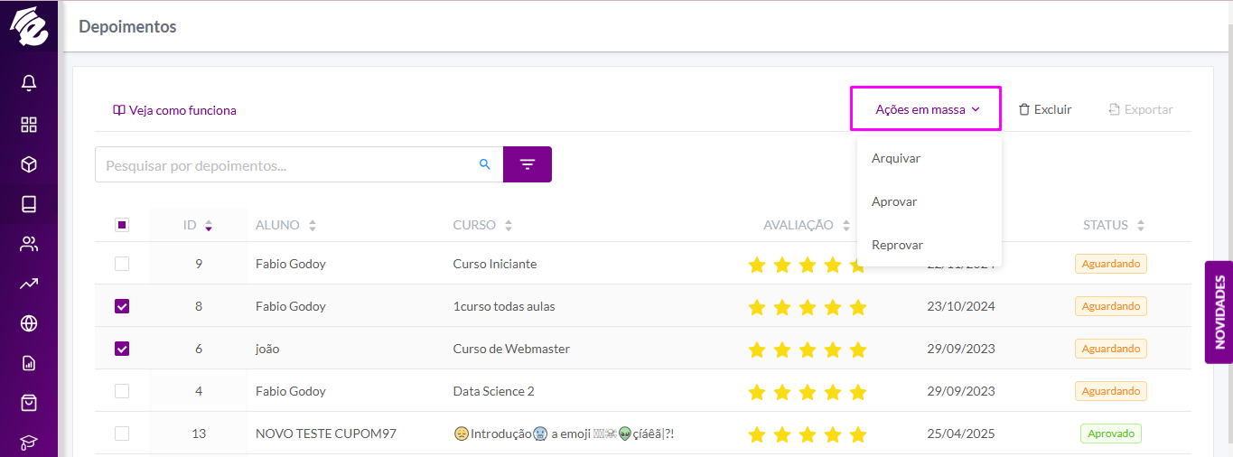 Caso queira remover vários depoimentos de uma só vez, clique na caixa de seleção e depois no topo em Excluir.