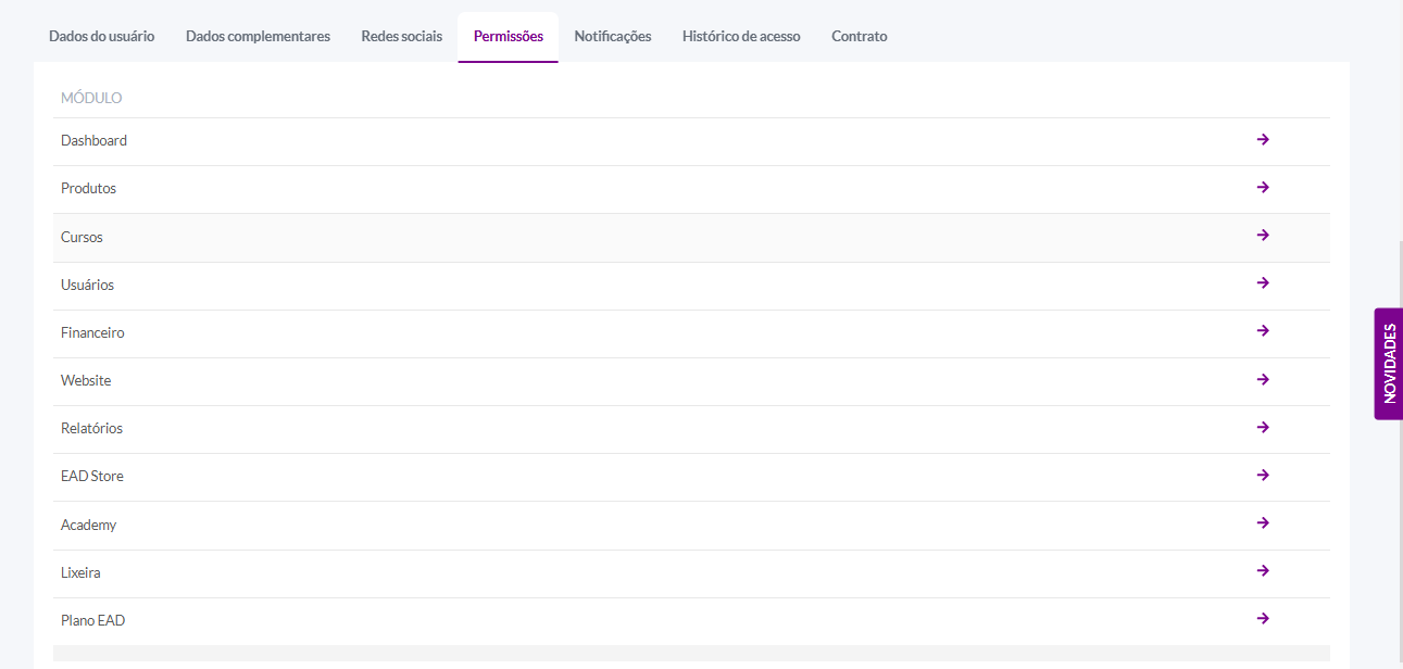 A nova versão da plataforma trouxe uma navegação mais fácil das permissões, separando pelos principais módulos. Ao clicar em algum deles, serão listadas somente permissões daquele módulo.