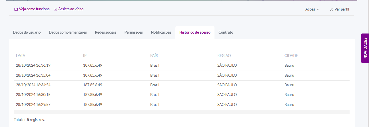 Essa seção armazena cada login do aluno exibindo o IP, data e hora e localização no momento do login.