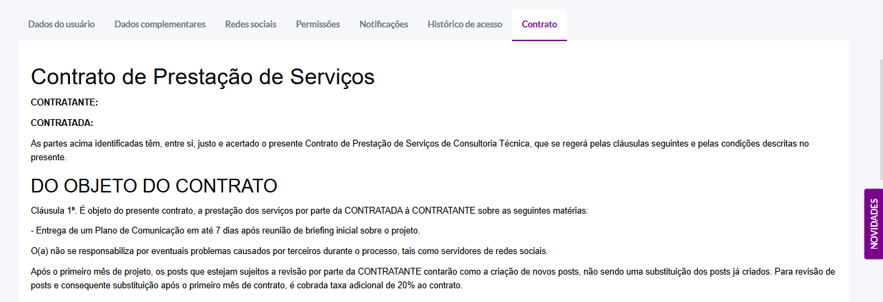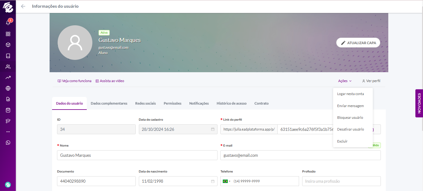 Nessa seção você encontra informações sobre a página de detalhes do usuário, com todas as informações pessoais e permissões.