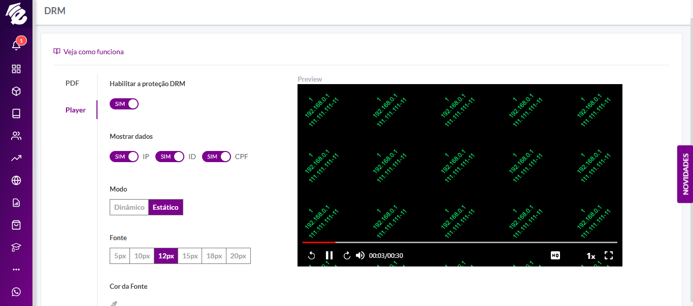 O DRM faz parte de toda a infraestrutura que fornecemos para proteger seu conteúdo contra a pirataria. É uma marca d'água embutida nos arquivos que exibe informações dos alunos caso você deixe habilitado também no controle de acesso das aulas.