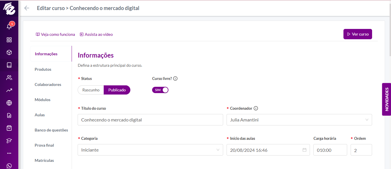 Aqui ficam todas as informações do curso e outros cadastros auxiliares como provas, módulos, aulas e Quiz.