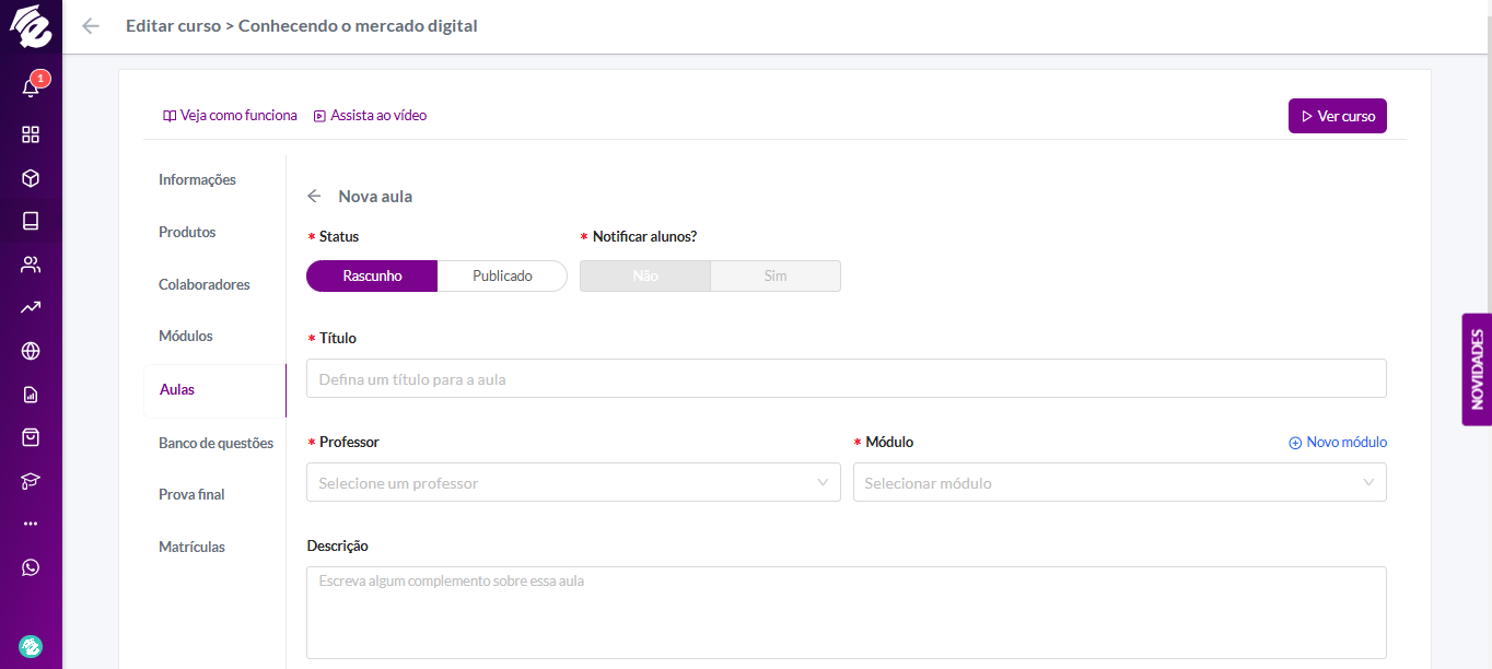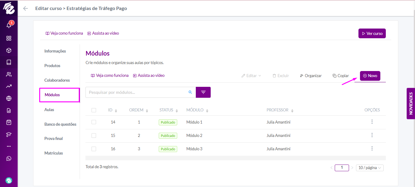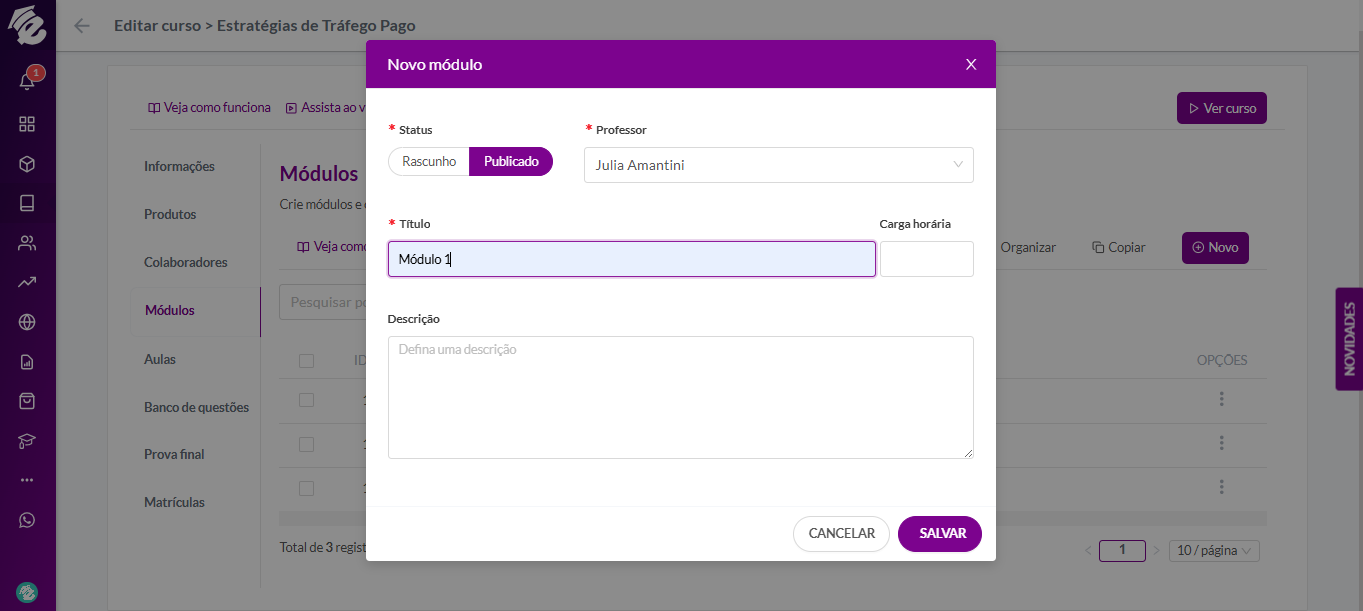Para cadastrar um novo módulo, clique no canto direito em Novo. Basta preencher o campo status (Publicado ou Rascunho), Professor, nome do módulo e caso queira, uma descrição para ele.