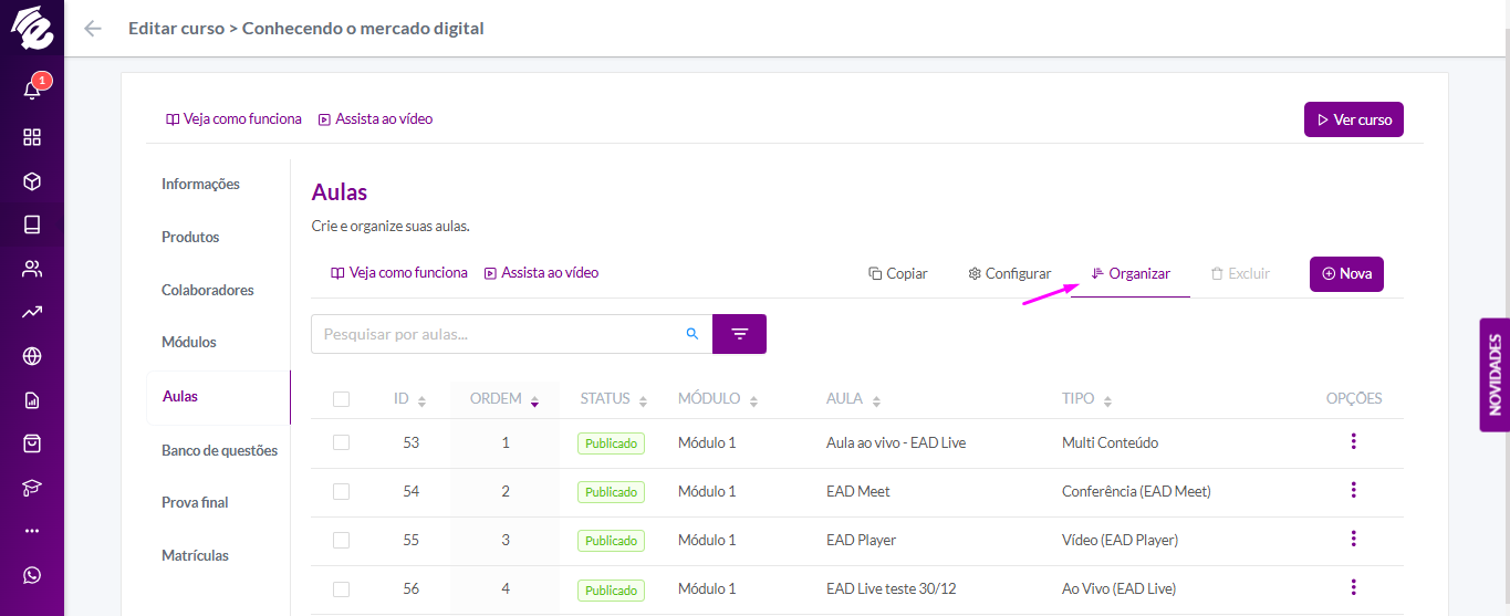 Na listagem de módulos e de aulas, você conta com uma ótima opção para reordernar seu conteúdo dentro do curso! Basta usar a opção Organizar Aulas e arrastar os itens na ordem desejada.