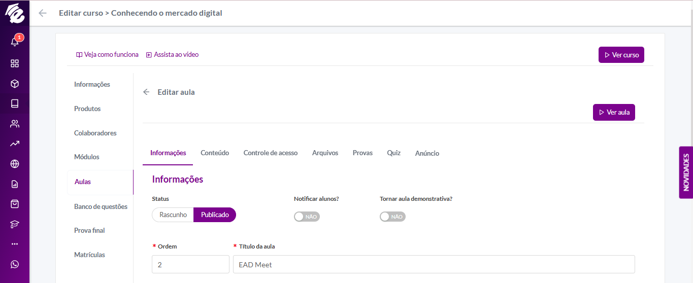 Para acessar o cadastro da aula, clique na aula desejada na listagem em Opções > Detalhes, ficará visível a aba Informações. Defina o status da aula, título, duração e a qual módulo ela pertence.