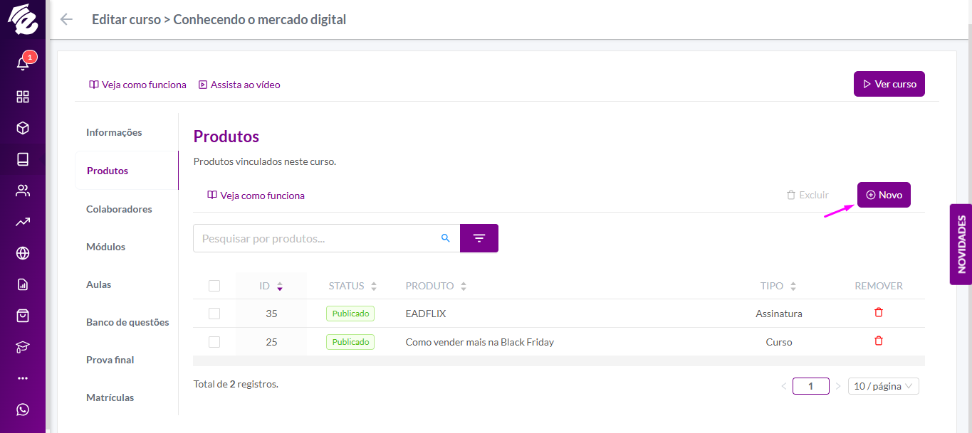 Para desvincular o produto do curso, basta clicar no ícone da lixeira na lista de produtos para removê-lo.