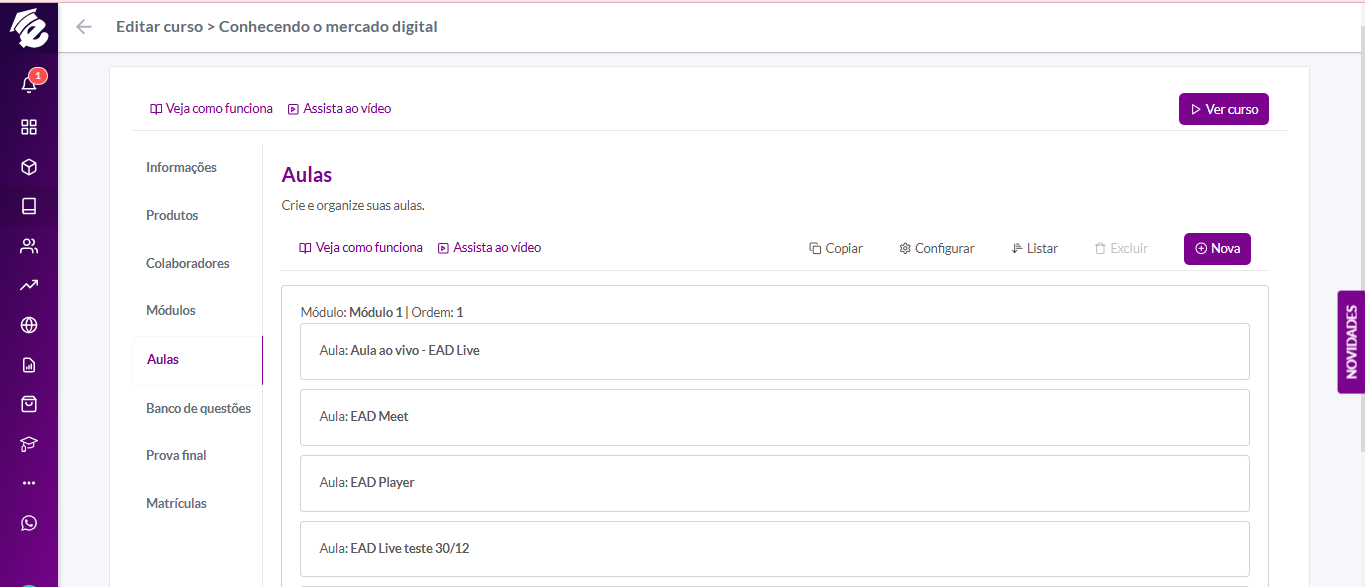 Acesse: Menu> Cursos > Todos os cursos > Aulas > Configurar