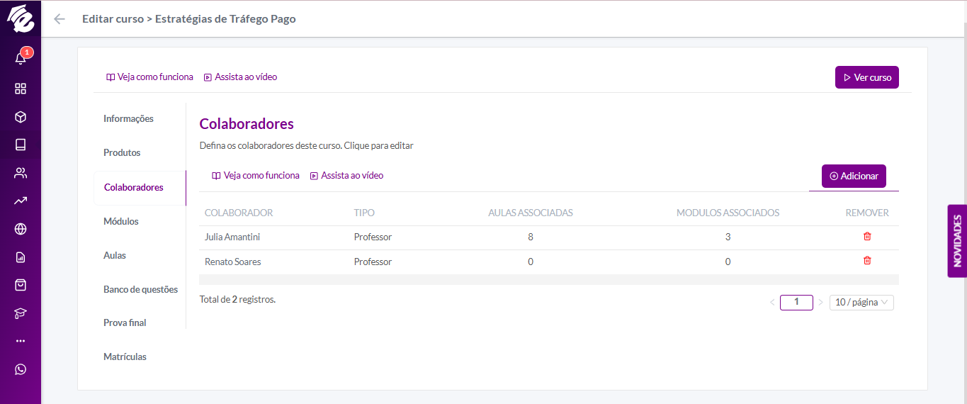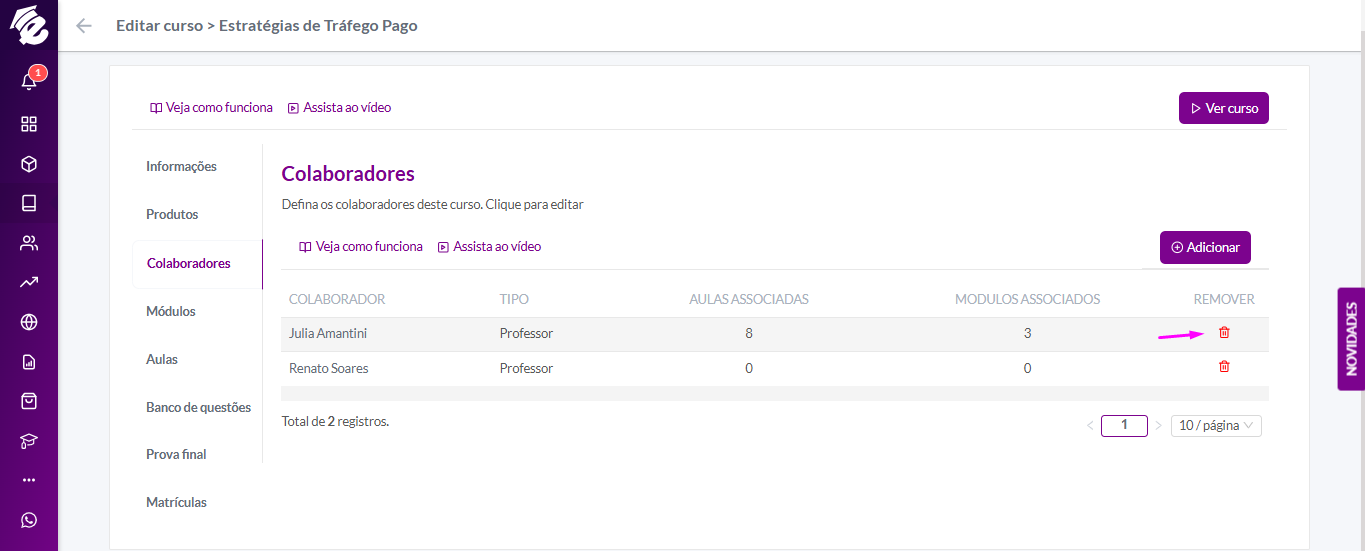 Para desvincular o colaborador do curso, basta clicar no ícone da lixeira na lista de colaboradores para removê-lo.