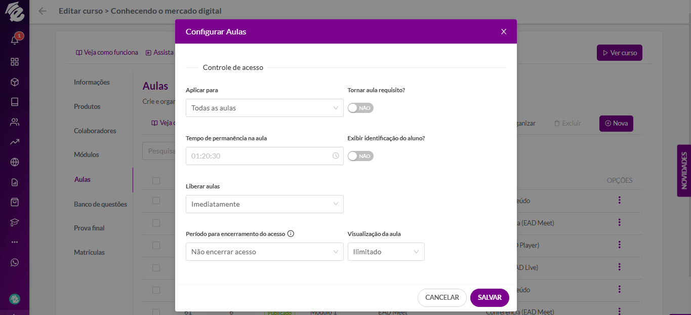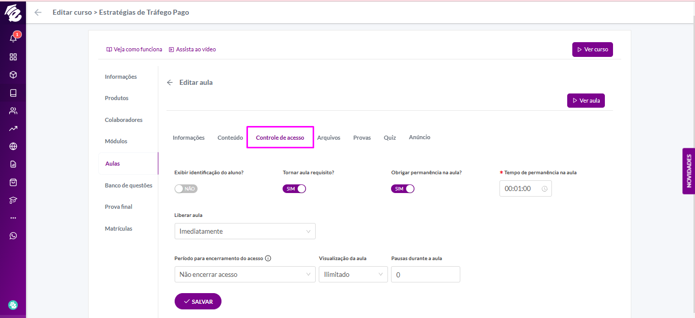 Importante:Essa opção de controle de acesso das aulas também se encontra no cadastro de cada aula!