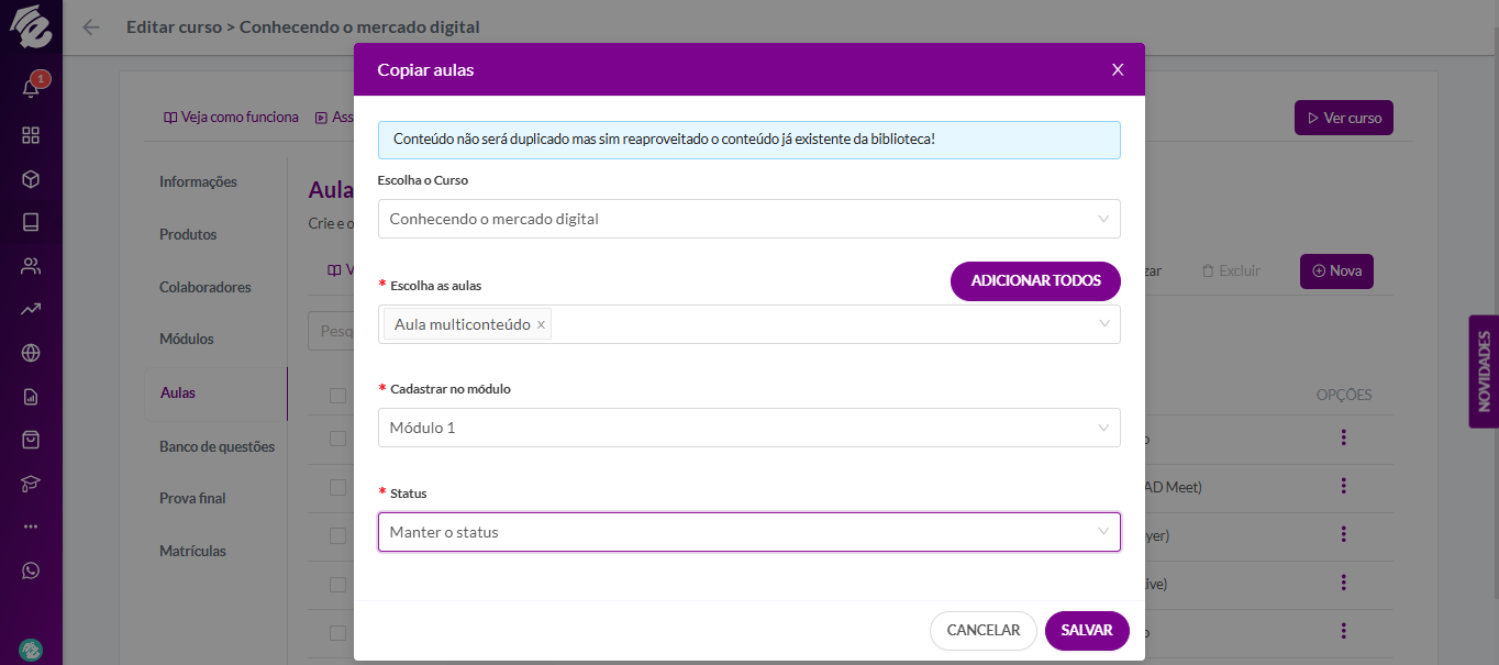 É possível copiar várias aulas, basta selecioná-las na lista. Informe qual o status delas, se serão publicados ou se ficarão em rascunho, e em qual módulo serão inseridas: