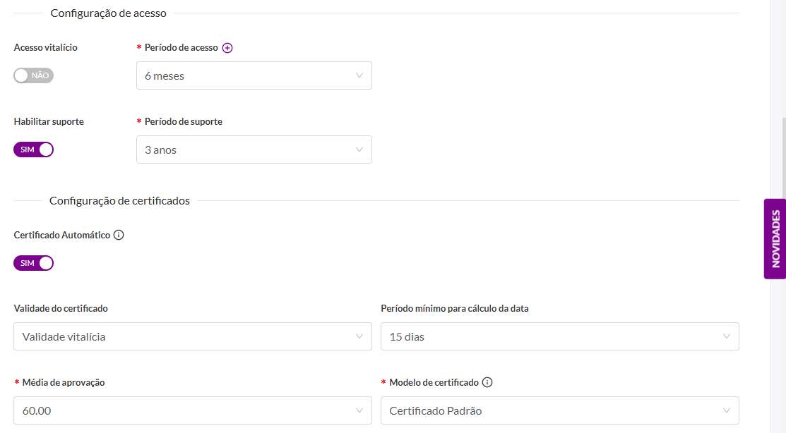 Defina se o seu curso terá emissão de certificado. Caso sim, é possível usar o modelo padrão ou o seu próprio modelo de certificado;