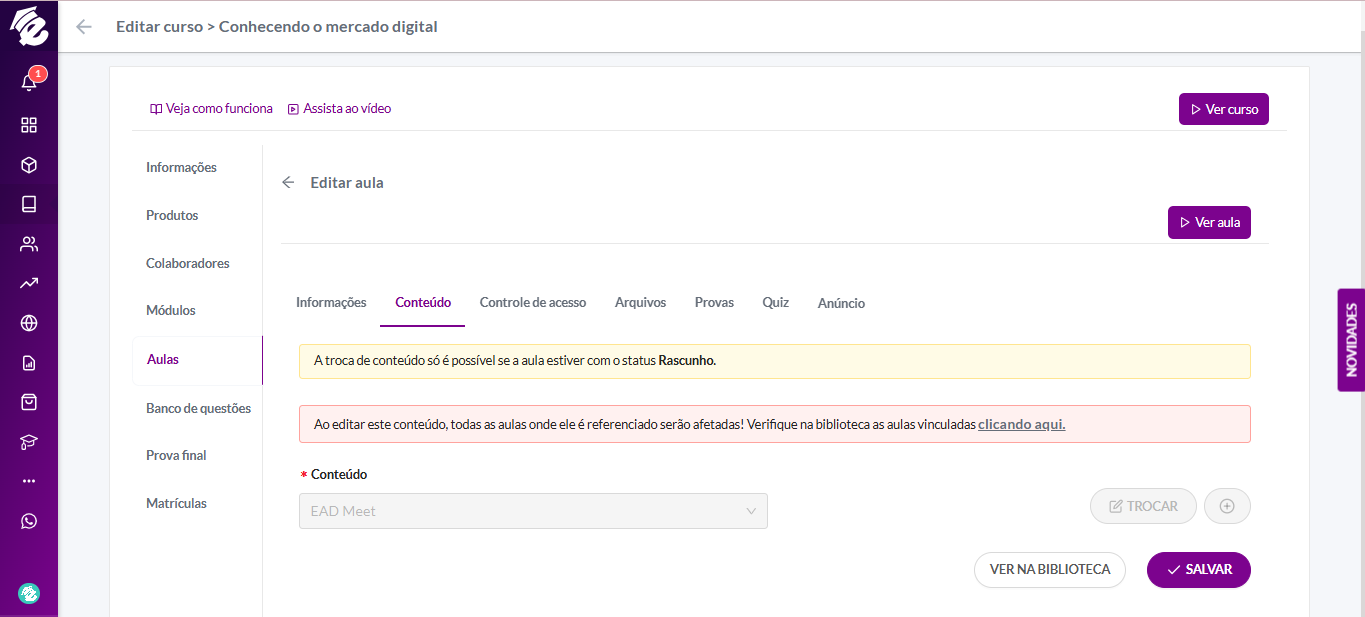 Nessa aba será exibido o conteúdo da aula, sendo possível trocar o conteúdo ou copiar informações da aula, como no caso da aula ao vivo onde é necessário copiar o Link de transmissão e Chave Stream.