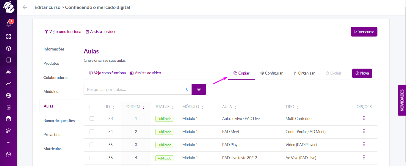 Também é possível realizar a cópia de aulas de outros cursos, para facilitar o gerenciamento nos cursos e permitir que você replique um conteúdo a outros locais.