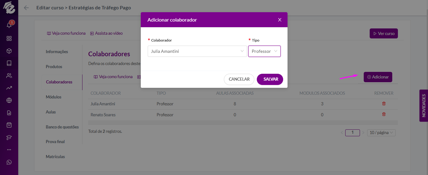 Nessa aba ficam listados todos os professores que fazem parte do curso. Para adicionar um novo colaborador, clique no canto direito em Adicionar: