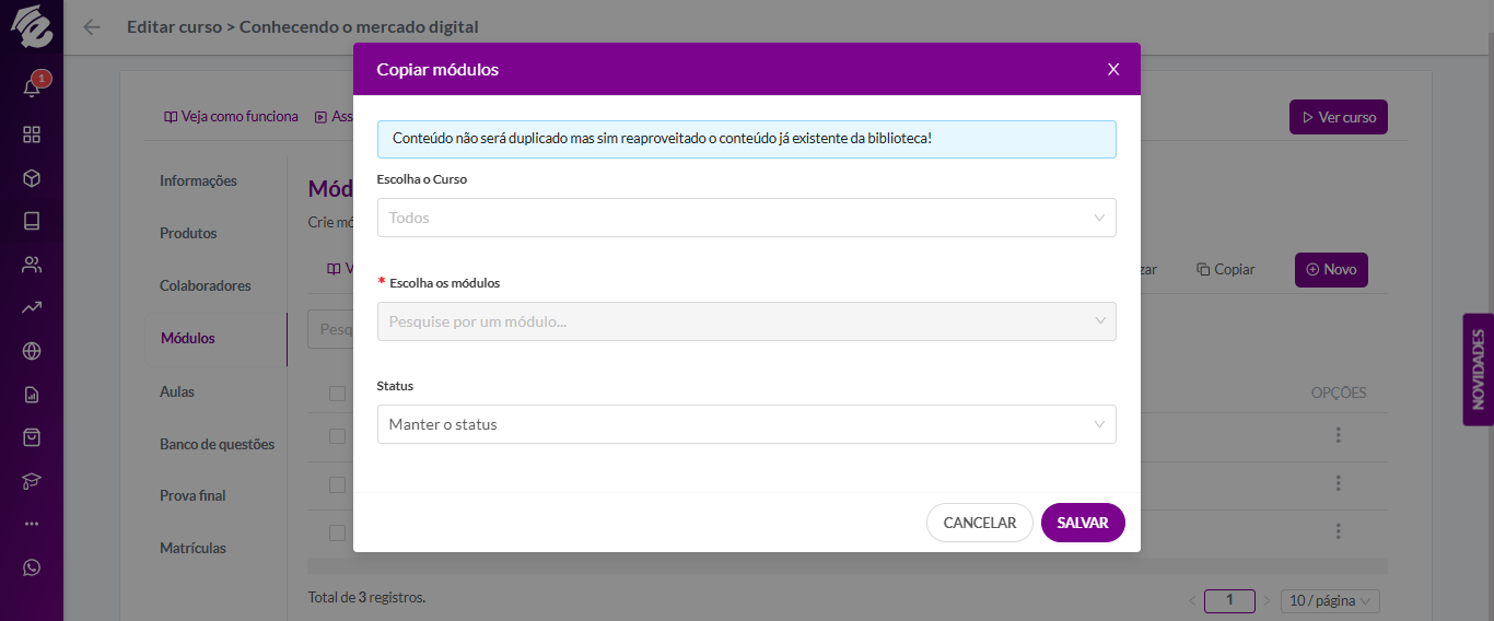 Também é possível realizar a cópia de módulos de outros cursos, essa novidade permitirá que você tenha agilidade para duplicar informações já existentes na plataforma.