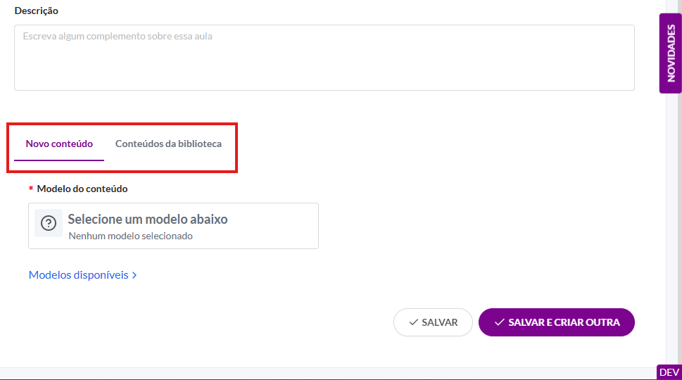 Depois, defina se a aula terá um arquivo já cadastrado na bibliioteca em "conteúdos da biblioteca" ou se deseja fazer upload de um novo arquivo, em: "novo conteúdo":
