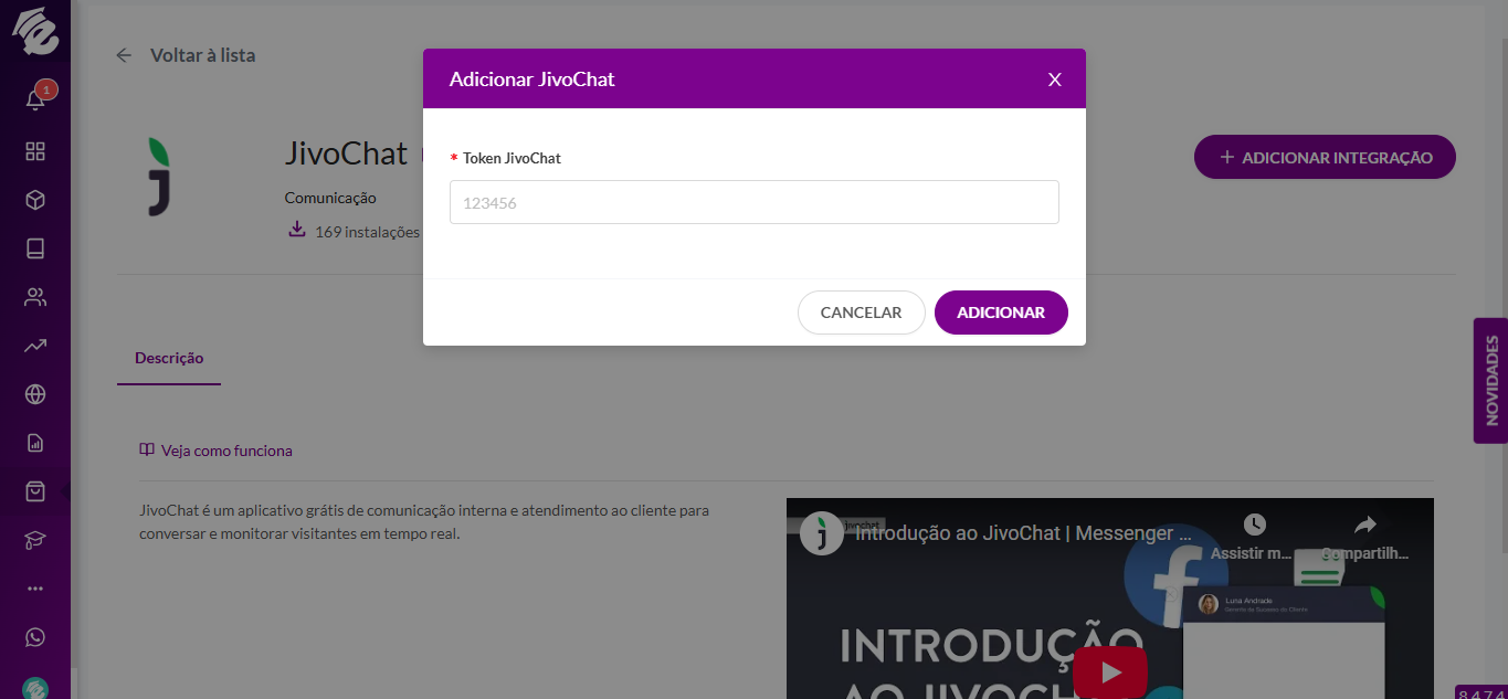 Clique no botão Adicionar Integração e informe o código token gerado no JivoChat: