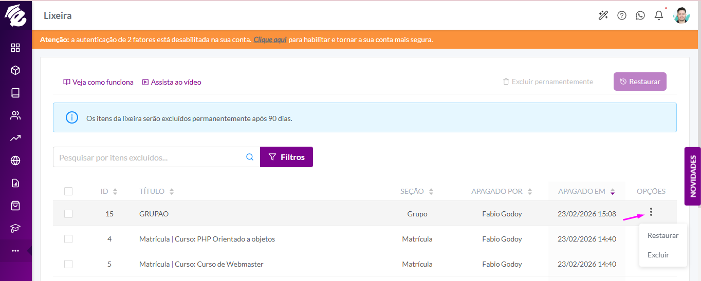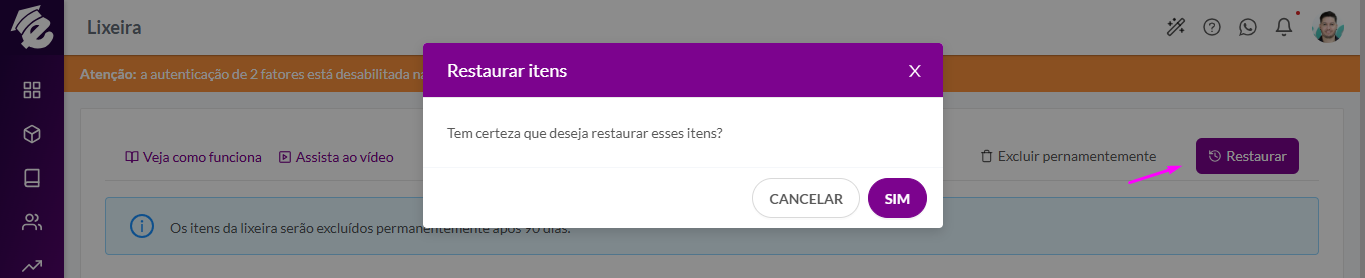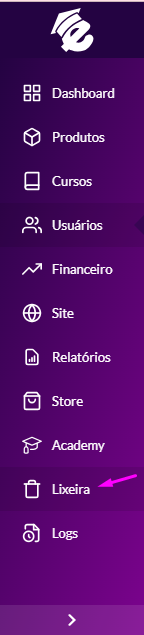 Mas também existe a opção de excluir definitivamente, que é feito também nessa tela. Para acessar, clique no menu lateral em Lixeira