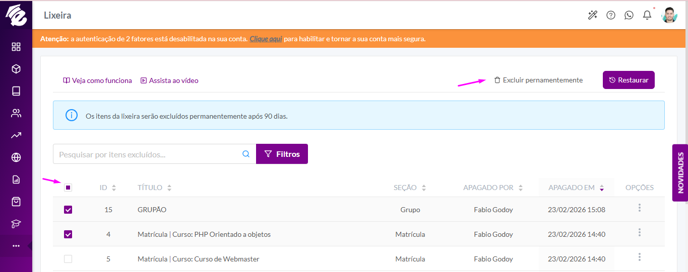 DicaAo filtrar uma seção (Aulas, Certificados), o EAD exibe o checkbox para selecionar registros em massa e restaurá-los ou excluí-los definitivamente.