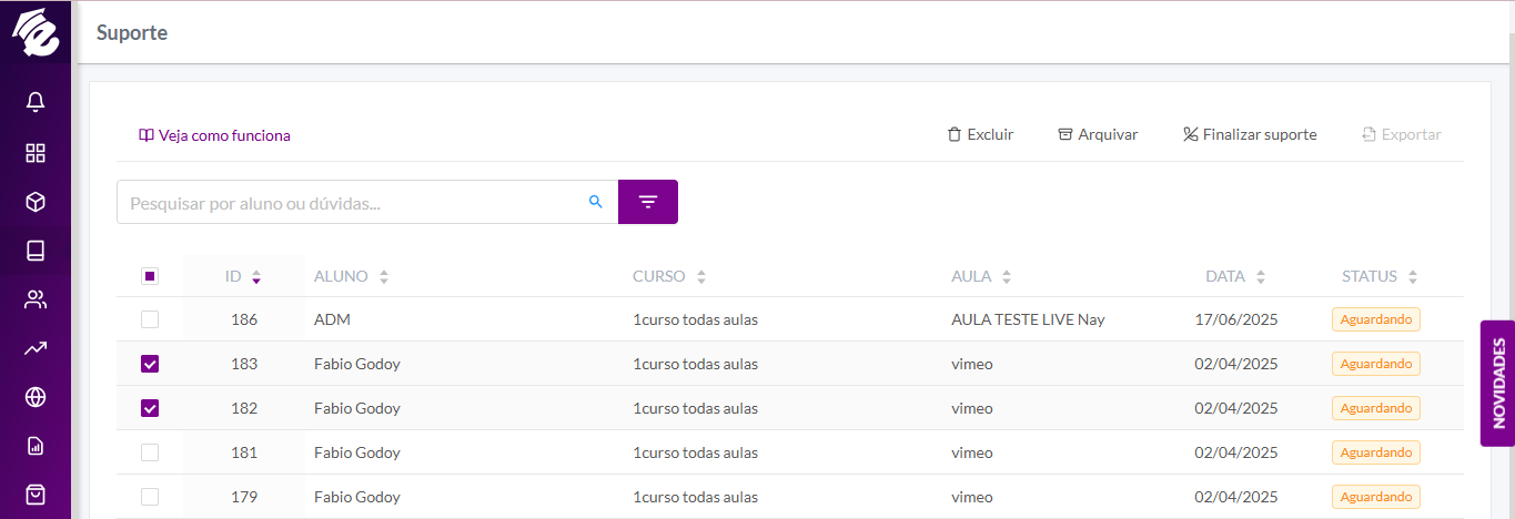 A área de suporte recebe as dúvidas de todas as aulas de todos os cursos, caso você tenha habilitado a opção de Suporte no cadastro dos cursos. Mas não se preocupe, é possível filtrar as dúvidas pesquisando pelo nome do curso, nome da aula ou nome do aluno.