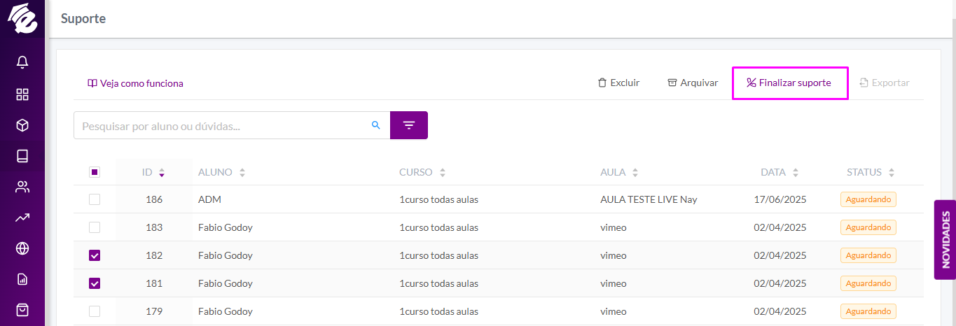 Retorne a lista principal e marque os tickets desejados, depois clique em Finalizar suporte. Ou também pode-se remover os registros em massa.