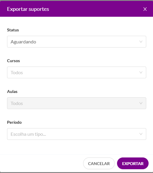 Se precisar exportar os registros para uma planilha, deixe as caixas de seleção desmarcadas e clique no topo em Exportar. Depois faça o filtro dentro da janela podendo escolher o status, o curso, qual aula do curso obteve o ticket de suporte e também o período dos registros.