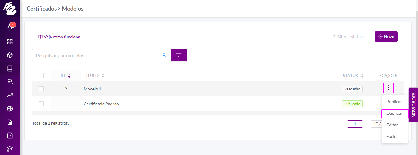 Caso queira duplicar um dos modelos, clique em Opções > Duplicar.