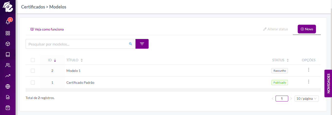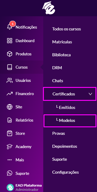 Essa seção armazena os certificados emitidos assim que os alunos concluem a visualização de aulas nos cursos ou aprovação nas avaliações caso tenha. Também é possível criar certificados manualmente, caso você queira realizar algumas verificações antes de emití-lo ao aluno. Acesse no menu lateral a opção Cursos > Certificados > Modelos para visualizar essa opção.