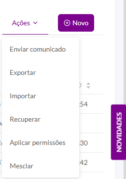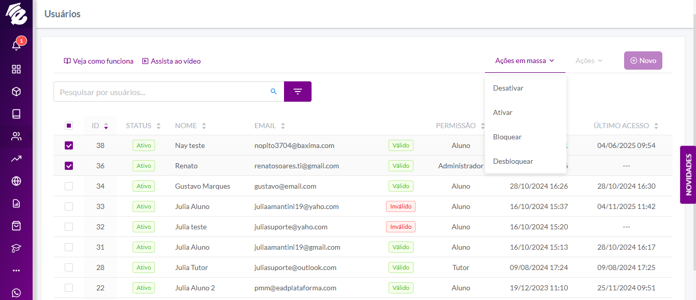 Caso você selecione os usuários em massa, o botão Ações no topo irá exibir outras opções, sendo: