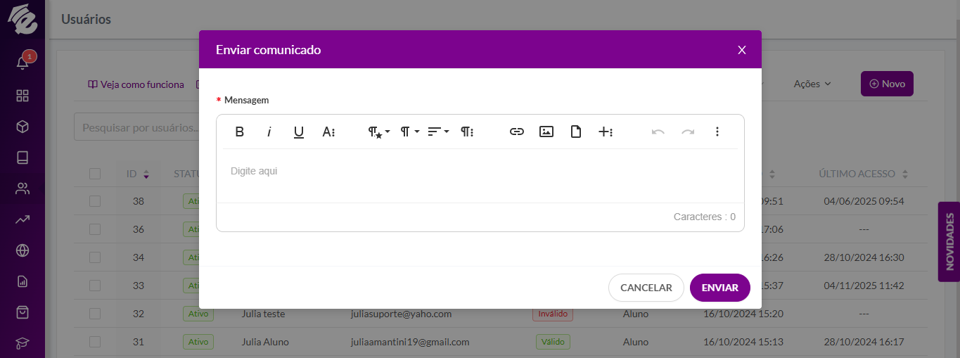 Permite enviar um comunicado com editor de texto HTML para todos os usuários cadastrados no EAD. Eles receberão a notificação dentro da plataforma;