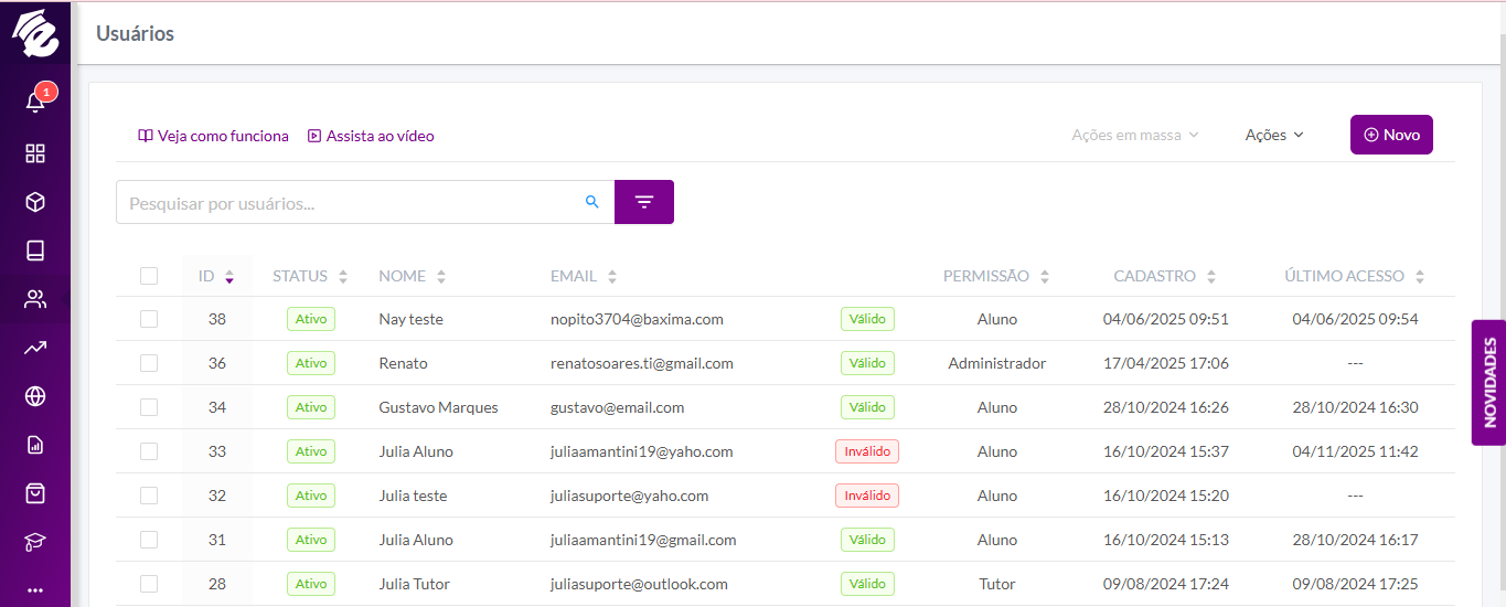 Aqui vamos tratar do módulo de Usuários e suas configurações. E nada melhor do que o cadastro de usuário para começar a falar dessa seção! Para ver como ficou a lista de usuários na nova versão, clique no menu lateral na opção Usuários > Todos os usuários: